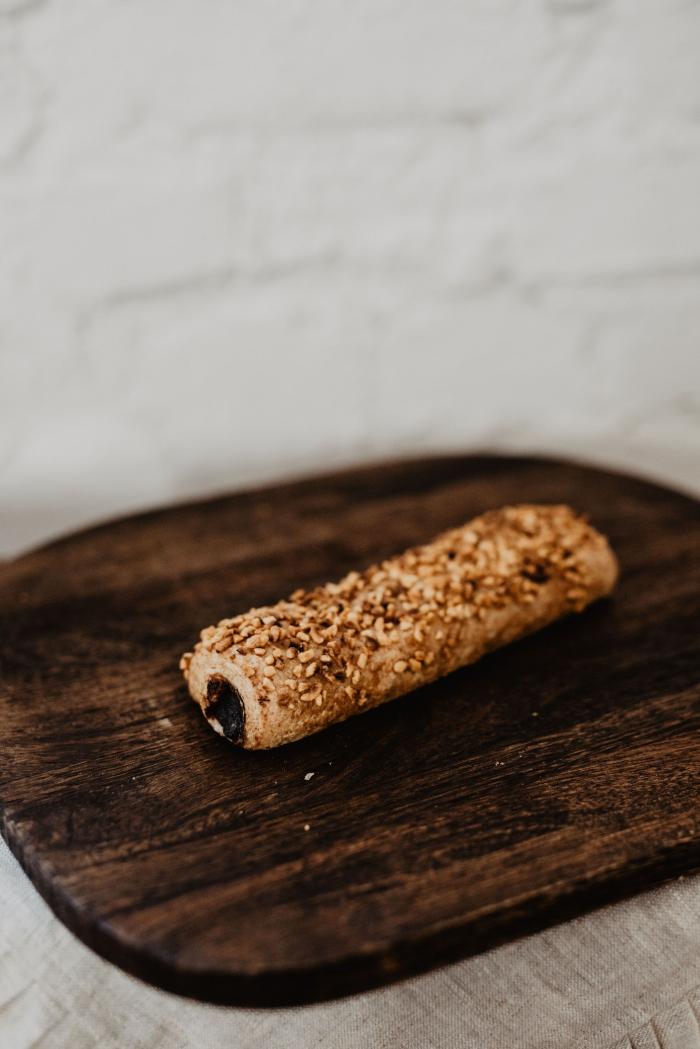 Összetevők: lteljeskiörléső tészta, liszt, viz, só, Belga lapvaj, cukormentes szilvalekvár almával, törökmogyoró.