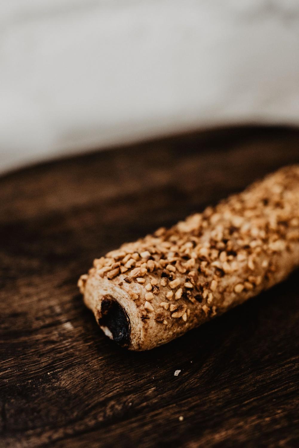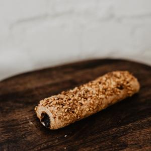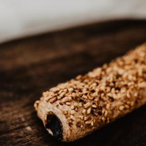 Teljeskiörlésű cukormentes szilvás rúd a tetején pirított törökmogyoróval.
